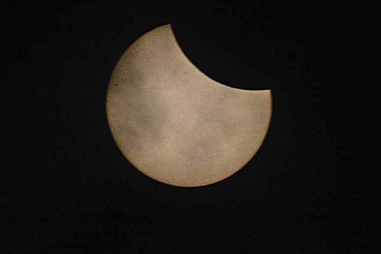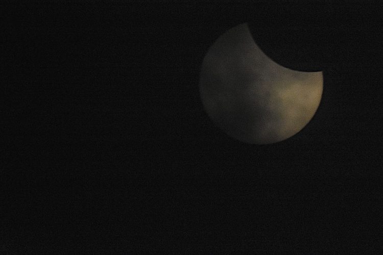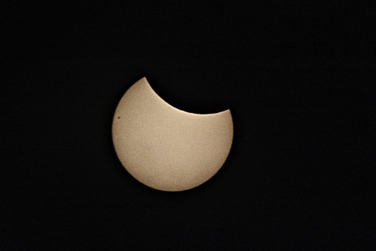 Beaucoup de passages nuageux ont compliqué l’observation mais c’était toujours mieux que la couverture totale annoncée par certains modèles météo (dont Arome de Météo-France !)… J’ai des progrès à faire en matière de définition et de mise au point. Je crois que le filtre solaire que j’utilise, s’il protège bien le matériel et les yeux, est trop dense : être obligé de pousser les ISO à 6400, pleine ouverture (f9 avec le multiplicateur de focale) et vitesse très basse (1/20ème de seconde) pour photographier l’objet le plus lumineux autour de nous n’est pas normal. Avis aux connaisseurs, j’écoute tout conseil ! Enfin, le point noir à gauche n’est pas un défaut mais bien une tache solaire. C’est sympa qu’elle soit apparue ce jour-là, les précédentes, l’activité solaire était au plus bas !